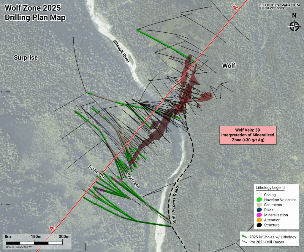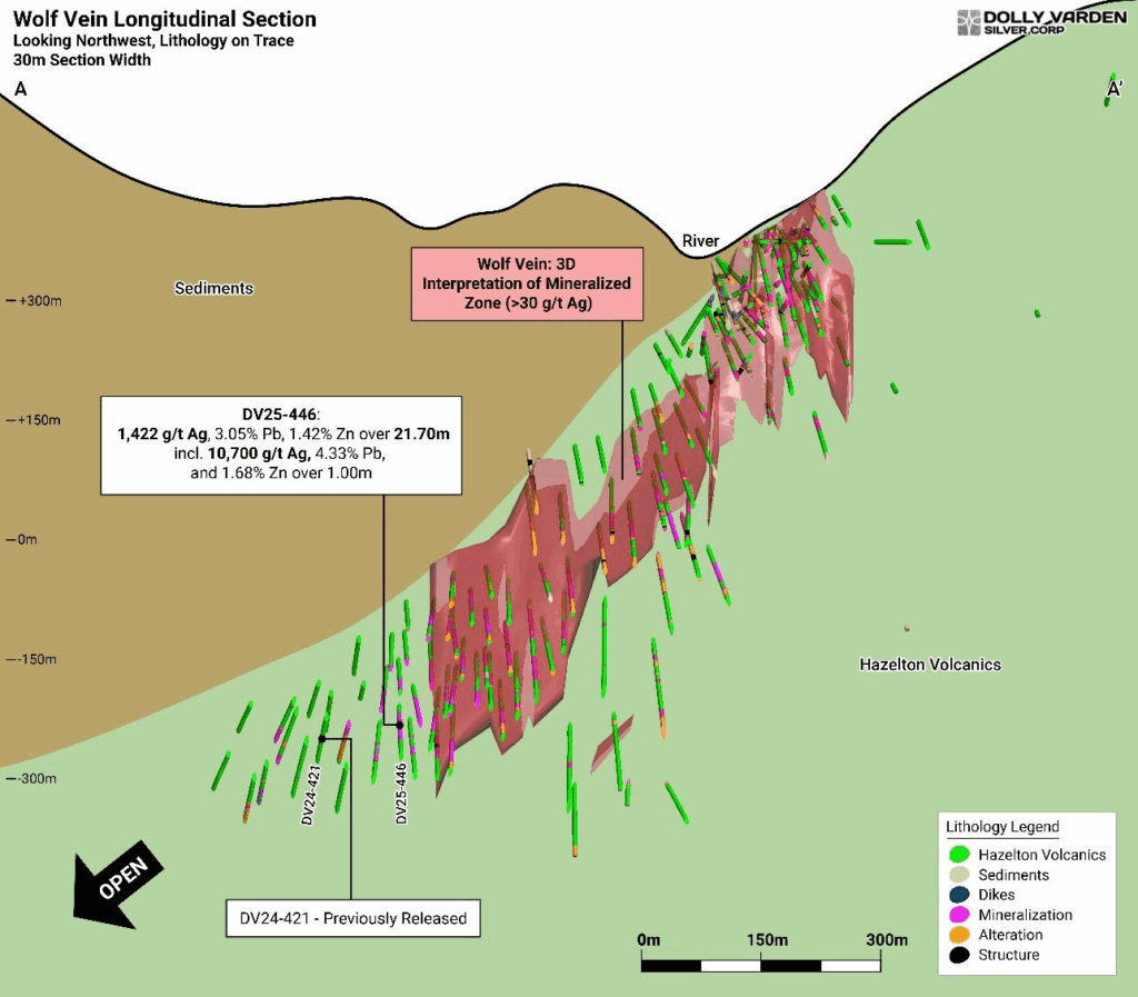 “These high-grade silver results over wide intervals suggest excellent continuity at the Wolf Vein. The mineralization in drill hole DV25-446 includes abundant native silver and is consistent with the robust style of mineralization with a significant increase in associated gold and base metal values. Additional drilling at Wolf is being prioritized for the remainder of the season,” said Shawn Khunkhun, CEO of Dolly Varden Silver.