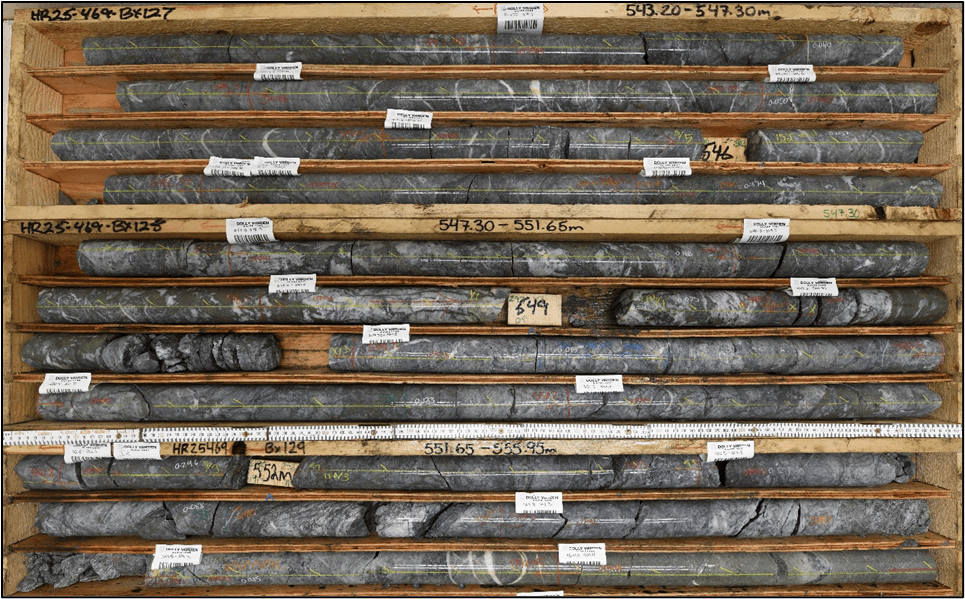 HR25-469: 26.74 g/t Au over 14.76 meters, including 122 g/t Au over 2.85 meters within a broader mineralized zone grading 12.13 g/t Au over 33.80 meters