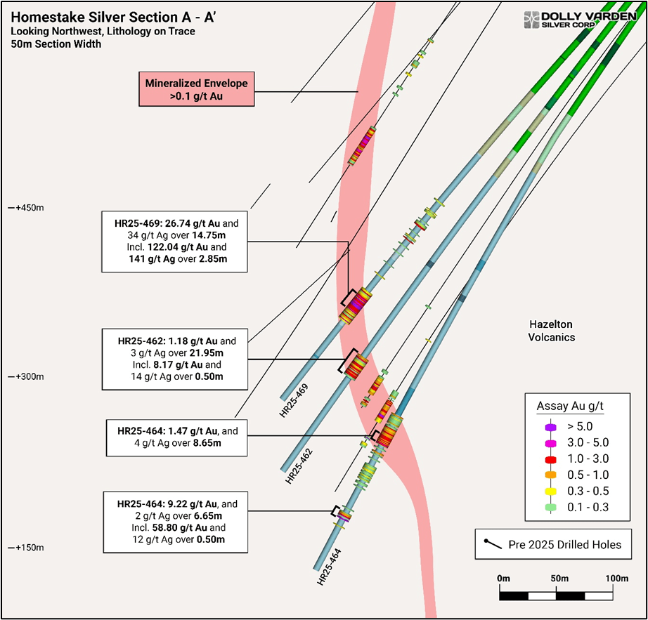 VANCOUVER, BC, November 10, 2025, Dolly Varden Silver Corporation (TSX-V: DV | NYSE MKT: DVS | FSE: DVQ) (the “Company” or “Dolly Varden“) is pleased to report results from drilling that expands the high-grade gold zone within the Homestake Silver deposit. Hole HR25-469 targeted a large open area at the Homestake Silver Deposit, intersecting 26.74 g/t Au over 14.75 meters, including 122 g/t Au over 2.85 meters within a broader mineralized zone grading 12.13 g/t Au over 33.80 meters.