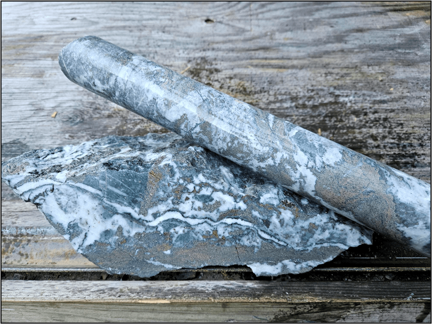 Figure 1. Homestake Silver NQ drill core from hole HR25-469 of a sample interval grading 91 g/t Au over 0.63 meters compared to a slab with similar gold grade from the 320 level at Ascot Resources Ltd.’s Premier Mine near Stewart, BC. Mineralization hosted in multi phase vein and vein breccias with strong pyrite, chalcopyrite, galena, sphalerite and visible gold
