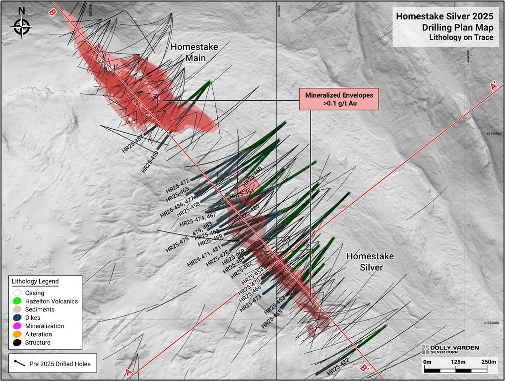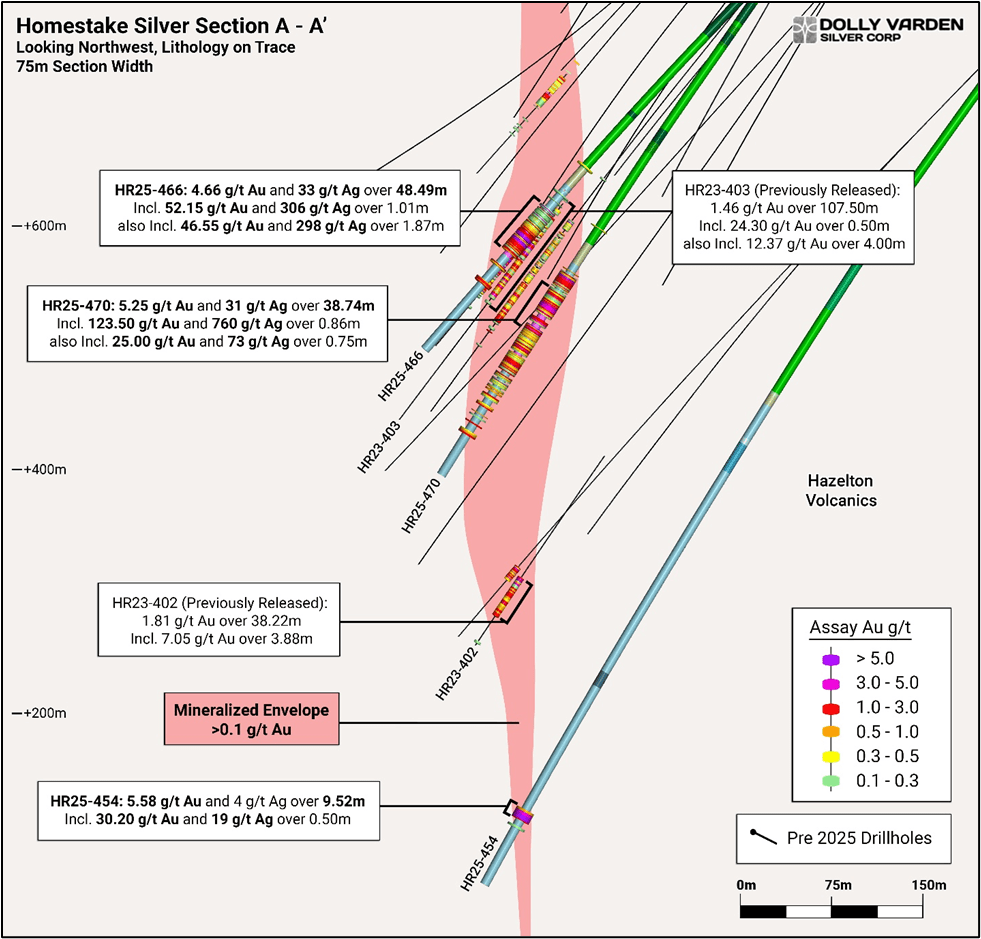 VANCOUVER, BC, February 4, 2026, Dolly Varden Silver Corporation (TSX-V: DV | NYSE MKT: DVS | FSE: DVQ) (the “Company” or “Dolly Varden“) is pleased to report results from drilling that successfully infilled and expanded the northerly plunging, high-grade gold and silver mineralized trend at the Homestake Silver deposit. A total of 29 drill holes were completed at Homestake Silver and two at Homestake Main in the 2025 program, five of which have been released previously. Highlights from the silver-rich southern portion of the deposit from drill hole HR25-466 intersected a wide mineralized zone averaging 4.66 g/t Au and 33 g/t Ag over 48.49 meters and included narrower high-grade veins and vein breccias returning grades of 52.15 g/t Au and 306 g/t Ag over 1.01 meters and 46.55 g/t Au and 298 g/t Ag over 1.87 meters.